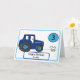 Carte de 3e anniversaire avec un tracteur bleu et un chien. Cette carte illustrée est parfaite pour un parent ou un grand-père à donner à un fils/petit-fils à trois ans. Cette carte indique, "Joyeux anniversaire" à l'extérieur et comprend de l'espace pour l'âge et le nom du garçon. Le message intérieur peut également être personnalisé.