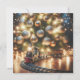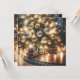 Cartes de Noël adorables que vous pouvez personnaliser avec votre propre message de vacances. Le devant est une scène adorable avec une voie ferrée vintage autour d'un arbre de Noël orné d'ornements dorés et de lumières illuminées.