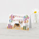 Illustration originale de Destei d'un tricolore à tête rouge couleur Pembroke Welsh Corgi race dog. Le chien est placé dans un cadre d'anniversaire coloré avec des ballons d'anniversaire de couleur pastel, des cadeaux et une bannière de bunting. Les couleurs pastel sont le rose, le vert, le bleu, le rouge, l'orange et le violet. Le chien est debout sur une texture de plancher de bois jaune et l'arrière - plan a un motif de pois de couleur pastel ludique.