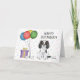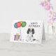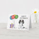 Design à thème d'anniversaire mignon avec le dessin original de Destei illustrant une jolie couleur tricolore Cavalier King Charles Spaniel race dog. A côté du chien il y a des ballons colorés d'anniversaire attachés sur un os de chien et une boîte cadeau de couleur violet et jaune. L'arrière - plan a un motif ludique de confettis pastel colorés sur un arrière - plan blanc. Il y a aussi une zone de texte personnalisable qui se lit maintenant : "Joyeux anniversaire !".