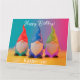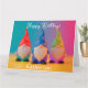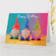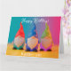 Un rendu numérique vibrant et ludique de trois figurines de gnome de jardin stylisées avec une finition en céramique brillante. Chaque gnome porte un chapeau haut et incurvé rouge, bleu ou vert lime, associé à une barbe blanche texturée et un nez rond couleur pêche. Le trio est disposé sur une surface jaune vif sur un fond dégradé coloré de sarcelle, rose et orange. Personnalisez-le pour les anniversaires avec le nom de votre choix.