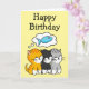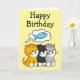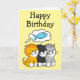 Souhaitez un joyeux anniversaire à quelqu'un avec cette adorable carte. Trois adorables chatons assis en rang, l'un est un tabby roux, un autre est un tuxedo noir et blanc et le troisième un petit chat gris. Ils pensent tous joyeusement au délicieux poisson bleu qu'ils auront pour le thé. Le fond est d'une couleur jaune clair.