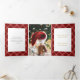 Festive décoratif "Happy Holidays" accueil en calligraphie dorée et plaid rouge avec effet en faux relief avec modèle photo et trois lignes de texte modifiable. Les panneaux comportent des champs de texte rouge plaid arrière - plan, modèle photo et des champs de texte modifiables supplémentaires.