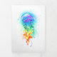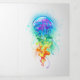 Grande méduse irisée, artistiquement dessinée, brillante, avec de longues tentacules sur le blanc, peinte sur l'arrière - plan multicolore. Méduse arc-en-ciel.