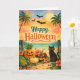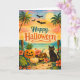 A vibrant, tropical-inspired Halloween illustration set against a glowing seaside sunset and full moon. Palm trees sway beneath a pastel sky as playful bats fly overhead, while tiki torches flicker warmly along the shore. Smiling jack-o’-lanterns—one carved from a pineapple and another from a coconut—add a whimsical island twist, joined by hibiscus flowers, lush greenery, and a sleek black cat watching calmly from the sand. The bold “Happy Halloween” lettering and rich, sunset-soaked palette create a fun, unexpected fusion of Halloween charm and tropical paradise.