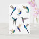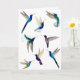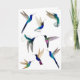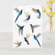 Cette carte présente pour toutes les occasions plusieurs espèces de colibris tropicaux tels que les colibris de Coronet violet velours, le Starfrontlet à gorge bleue, le jacobin à cou blanc, le saphir à queue dorée et les colibris à queue hirondelle. Images tirées de peintures originales sur aquarelles de Christiane Dobbins. L'intérieur est laissé vide pour votre propre message manuscrit.