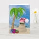 Cute sand snowman on beach with tropical palm tree decorated with ornament ts and holiday gifts in beach sand.