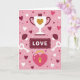 This card shows a soft pink background filled with small hearts in white, pink, and dark red, plus a few tiny white stars and little dark red mushrooms with heart spots. Near the top, there’s a white trophy with a dark red detail and a gold heart emblem, like love is the prize. Under it sits a dark red banner that looks like a ticket edge, with the word “LOVE” printed in simple white letters across the center. On both sides of the banner are two white keys, each with a heart shape at the top, angled downward as if they’re meant to be used. At the bottom, a bright pink heart-shaped padlock waits with a gold keyhole in the middle. The whole scene feels sweet and romantic, with everything pointing toward opening that little lock ❤️. It’s a cute way to say love can be earned, found, and kept close 💕.