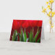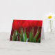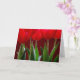 Carte avec tulipes rouge vif contre un arrière - plan rouge foncé