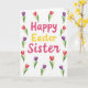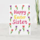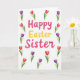 This card features a centered greeting that reads “Happy Easter Sister,” with “Happy” and “Sister” in candied pink brush lettering and “Easter” tucked between them in sunny yellow. The text sits on a white background, leaving plenty of open space so the words feel front and center. Around the message, small tulips form a light border, spaced out like little notes passed between close friends 🌷. The tulips alternate between warm red-orange and deep purple, each with a slim green stem reaching upward. Soft watercolor edges and slight paint variations give the flowers a gentle, affectionate look, like they were painted with someone special in mind. Bright, even lighting keeps the colors crisp while still letting the tender details show through 🐰. A few tulips appear near the corners, with others floating along the sides to frame the lettering.
