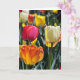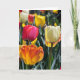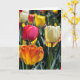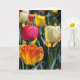 Des tulipes colorées sont illuminées par le soleil de fin de l'après-midi. Notez que cette carte peut être customisée avec votre propre inscription personnelle.