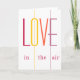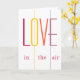 Carte de vœux moderne et colorée de la Saint-Valentin avec un script de typographie LOVE gras et audacieux en rouge bordeaux foncé, jaune, orange corail et violet lilas.