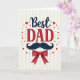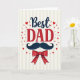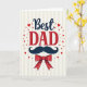 Cette carte est centrée sur un message affectueux « Meilleur PAPA », avec « Meilleur » placé en haut en lettres bleu marine profond et « PAPA » juste en dessous en lettres rouges intenses avec de petits traits d'encadrement. Les mots donnent l'impression de s'incliner l'un vers l'autre, comme une étreinte chaleureuse entre parent et enfant 👨. Sous le texte se trouve une moustache à la poignée de vélo bleu foncé avec des pointes soigneusement recourbées, donnant au design un aspect amical et élégant. Juste en dessous, un nœud papillon rouge vif avec de petits points blancs ajoute une touche joyeuse, comme quelqu'un prêt pour un jour spécial 👔. Le fond est rempli de rayures verticales douces qui alternent entre une couleur crème pâle et un beige clair, ajoutant une texture douce sans prendre le dessus. De petits cœurs rouges et de minuscules points rouges sont dispersés autour du centre, comme s'ils flottaient vers le haut dans une affection silencieuse. Le message principal reste au milieu de la carte, avec les cœurs et les