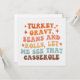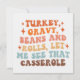 Ce design ludique et vibrant est parfait pour la saison automnale, en particulier Thanksgiving, avec la phrase amusante et accrocheuse "Dinde, sauce, haricots et petits pains, laissez-moi voir cette casserole." Le texte est disposé dans une mise en page empilée, chaque ligne utilisant une couleur différente d'une palette chaude et automnale. Les couleurs vont des oranges et des bruns riches aux roses, bleus et jaunes doux, reflétant l'atmosphère chaleureuse et festive des rassemblements automnaux. La police grasse et rétro ajoute une touche nostalgique et fantaisiste au design, tandis que les étincelles en forme d'étoiles dispersées çà et là renforcent l'ambiance de célébration.