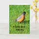 Un rouge-gorge orange et noir, photographié contre de l'herbe verte, est le sujet de ma carte "Un petit oiseau m'a dit C'est ton anniversaire".