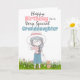 Une belle illustration d'une jolie jeune fille dessinée à la main et portant un casquette blanc avec un ruban rose et une jupe en denim et un haut à manches courtes rayées. Elle tient son casquette sur la tête d'une main et dans l'autre, elle a la tête de son mignon petit chien brun. Ils sont debout dans un champ rempli de jolies fleurs de printemps sauvages cosmos. Les mots, joyeux anniversaire à une petite-fille très spéciale (qui peut être changée en fille, nièce, filleul, etc) apparaissent sur un arrière - plan blanc et l'intérieur a un beau message tendre qui devrait être customisé pour convenir à toute relation familiale que vous avez insérée sur le devant.
