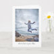 Une carte de voeux avec une femme qui saute pour la joie sur des rochers sur une plage. Ses bras et ses jambes sont partiellement étirés, ce qui en fait un saut de crabe. Elle porte une veste capitonnée contre le froid et ses cheveux se soulèvent au vent. Avec une expression joyeuse et des yeux larges, l'impression générale est d'exubérance sauvage.
