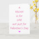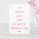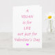 Carte Saint Valentin pour les Vegans. Le message dit "Un Végan est pour la Vie pas seulement pour la Saint-Valentin" en rose avec un petit coeur rose. À l'intérieur de la carte dit "Heureuse Sainte-Valentin". Personnalisez facilement cette carte en utilisant le texte modèle. Voir ma marchandise végétalienne dans ma collection Vegan dans mon magasin.