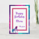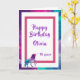 Une licorne d'imaginaire rose, violet et turquoise pour l'anniversaire d'une jeune fille/ado. Un cadre rose, violet et turquoise, un autre avec parties scintillant faux rose. Lettres violettes et texte : Joyeux anniversaire. Modèles pour le nom et l'âge. Couleur arrière - plan blanche. Intérieur : Espace pour écrire à la main.