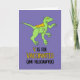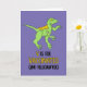 Faites savoir aux amis que vous êtes heureux qu'ils soient vaccinés avec ce dinosaure féroce. Cette carte de voeux présente l'illustration d'un vélociraptor en vert vif avec un bandage sur le bras où il a reçu sa balle au-dessus du message "V is for Vaccination (and Velociraptor)" contre un arrière - plan violet. Le message interne est prêt pour votre contact personnalisé