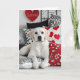Carte de Saint-Valentin du Labrador jaune. Canine cousue contre un arrière - plan contemporain en rouge, noir et blanc. Pas de fleurs, juste des coeurs et des sacs de tendresse. L'intérieur est laissé vide pour votre propre message. Le texte à l'avant est modifiable, tout comme le texte et le logo à l'arrière de la carte.