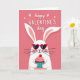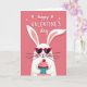 This card shows a white rabbit on a soft rose-pink background, looking sweet and calm. Its long ears have light pink tips, and its face is framed by big red heart-shaped sunglasses that make it look extra loving 💘. The rabbit holds a cupcake with swirled pink frosting and a single red cherry on top, like it’s offering a treat to someone special. Above the rabbit, the text reads “happy VALENTINE’S day,” with “happy” in smaller letters and “VALENTINE’S” in larger all-caps. The letters look like a mix of simple printed text and flowing cursive, and the words sit near the top of the card. Small red and pink hearts float around the message to match the theme ❤️. The overall scene feels warm, friendly, and perfect for romance or close friendship 😘.