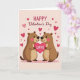 This greeting card shows two cute brown groundhog-like animals standing face to face in the center. They have round bodies, small paws, gentle smiles, and pink blush on their cheeks, which makes them look sweet and caring. Between them, they hold a shiny pink heart with the word “LOVE” written in white block letters. Near the top of the card, the text reads “HAPPY Valentine’s Day,” with “HAPPY” in simple sans-serif letters and “Valentine’s Day” in a flowing script style. The background is a soft blush color, with many small pink hearts floating around in different shades. The whole scene feels warm, calm, and full of affection, like a quiet moment shared between friends or partners