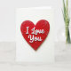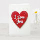 This greeting card shows a single red heart centered on a soft cream background, so your eyes go straight to it. The heart looks slightly worn in a sweet way, with tiny white specks and light scuffs across the surface. On the heart, raised white text reads “I Love You,” standing out clearly against the red. The words are arranged in three parts, with “I” and “You” in simple print and “Love” in a flowing cursive style. Small pearl-like white dots are scattered around the heart, adding a gentle, festive touch. The lighting is soft and even, with almost no shadows, which keeps the mood calm and sincere ❤️.