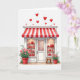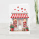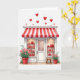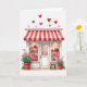 This greeting card shows a sweet little candy shop front made for Valentine’s Day. A red-and-white striped awning hangs over the entrance, and two bright display windows sit on either side. Inside, you can see shelves filled with heart-shaped gifts and treats in deep red tones, and the white paneled door in the center looks welcoming. At the bottom, red pots hold green plants with small pink flowers, adding a soft, friendly touch. A small wooden stool rests to the right of the door, like someone might sit and wait with a gift in hand. Above the shop, red hearts of different sizes float across the white background like confetti, setting a romantic mood ❤️💌🍫.
