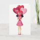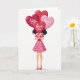 This greeting card shows a woman standing under a bunch of shiny heart-shaped balloons that cover most of her face. The balloons fill the top of the card in reds and pinks, and they look like they’re floating upward on thin strings. Each balloon has simple text on it, including “kiss me,” “love you,” and “hug me,” printed in easy-to-read letters right across the center of the hearts. The largest deep red heart sits in the middle and reads “love you,” and it blocks her face so the message stands out most. Below the balloons, she wears a rosy pink dress with small white polka dots, a darker pink ribbon at the waist, and matching pointed heels. A bit of her dark hair peeks out from behind the balloons, and the background is plain white so the hearts and messages are the main focus. It feels sweet and romantic, like a small reminder to say what you feel ❤️