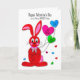 Funny and cute red bunny stepping out to wish a child Happy Valentine's Day. He's holding on to heart balloons in an assortment of colors.