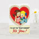 This greeting card shows a sweet mid-century style drawing of a boy and girl inside a large red heart. The girl has brown curly hair, rosy cheeks, and a pink dress, and she holds a red rotary phone receiver to her ear with a gentle, hopeful look. Next to her, a blond boy in a light blue shirt and a green bow tie holds a blue phone receiver and smiles with wide blue eyes. The heart has a cream and white stitched border that looks like lace, making the scene feel extra loving. The colors are bright and simple, with reds, pinks, blues, and touches of yellow that keep the focus on the couple and their call ❤️💌. Near the bottom, a cream banner reads “I’VE GOT THE ‘RIGHT NUMBER’” in black block letters, and just below it “It’s You!” appears in red script 🍫. It’s a cute, friendly way to say you’re thinking of someone special, so go ahead and share your Valentine’s Day feelings with someone you care about.