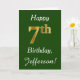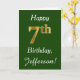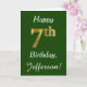 Ce simple design de carte d'anniversaire comporte le message "Happy 7th Birthday", avec le "7th" ayant une apparence fausse or. Il porte également un nom customisé et un arrière - plan vert foncé. On pourrait le donner à quelqu'un qui célèbre son septième anniversaire.