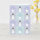 Four squares in pale blues and purples decorated with snowmen wearing top hats and winter clothing, like toboggans, scarves, and mittens. White stitching adds a decorative touch, giving the repeating pattern the appearance of a quilt, creating a perfectly cozy feeling for winter. The shape of a snowman creates a mask for the design to add a final seasonal touch to the inside and back of the card. Le texte de l'inside of the card can be change d to create a unique greeting of your own.