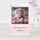 Une vieille dame aux rideaux roses dans les cheveux et à la robe rose tient une tasse à vapeur pour avoir un vieux anniversaire. L'arrière - plan du cadre est un motif de couleur rose et blanche en vichy. Tout le texte est modifiable.
