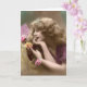 Vintage colorized photograph of a lovely looking woman with long messy hair looking at couple of pretty flowers.