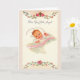 Une image vintage de carte de voeux montre un nouveau-né éveillé et souriant allongé dans un lit d'enfant ou un bassinet. Des guirlandes de roses roses ornent le dessus et le bas de la carte et une petite croix est centrée dans la guirlande rose sur la tête du bébé. L'avant de la carte dit "Bénissez votre petit ange" et le message à l'intérieur de la carte est "Un minuscule ange envoyé d'en haut est venu remplir vos coeurs d'amour. Félicitations !"