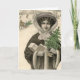 Le texte intérieur dit : "Je vous souhaite le plus beau des fêtes." Modifiez ce message à votre guise. Photo d'une carte postale vintage de Noël, avec une dame chargée d'arbres et un traîneau à cheval.