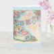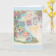 Une illustration vintage pour une nouvelle carte de félicitations pour bébé présente un petit bébé mignon dans un bassinet sous un arbre à fleurs. Au-dessus du bébé se trouve une ligne de vêtements avec de nouveaux vêtements pour bébé et un lapin lapin farci. Le recto de la carte dit, "Félicitations à la Famille Heureuse" et le message à l'intérieur de la carte est : "Je vous souhaite joie et bonheur, et plein de merveilleux moments ensemble."