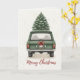 A cosy nostalgic Christmas card featuring a classic green car carrying a freshly cut Christmas tree on its roof. A festive wreath tied with a red bow decorates the back, adding a warm traditional holiday touch. Gentle snowfall accents and soft vintage colours create the feeling of an old fashioned festive journey. A heartfelt card for sharing Merry Christmas wishes in timeless style.
