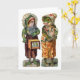 Deux illustrations vintages de grenouilles femelles habillées de vêtements humains, toutes deux debout sur les pattes postérieures. L'une est une mère tenant son bébé de grenouille qui donne des coups de pied et crie dans les bras de sa mère. Maman porte une robe fleurie jaune et orange et un bonnet blanc tandis qu'elle sourit en écoutant une autre grenouille chanter et jouer la machine vif. La grenouille rousse porte une jupe brune aux pois bleus, une écharpe bleue aux pois bruns et un bonnet blanc. Sa tête est inclinée en arrière alors qu'elle découpe une chanson et manipule sa machine vidée. L'intérieur de la carte est vide pour votre propre message.