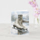A pair of white ice skates hangs from a rustic wooden post, surrounded by softly falling snow in a serene winter landscape of snow-covered trees, illustrated in watercolor