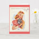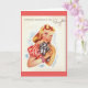 Une image de carte d'anniversaire vintage représente une jeune femme portant un chemisier rayé rouge et blanc. Elle câline un chiot tout contre elle. Le recto de la carte indique : « Joyeux Anniversaire à ma fille » et le message à l'intérieur de la carte est : « Tu mérites chaque sorte de bonheur que la vie a à offrir. »