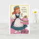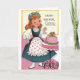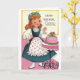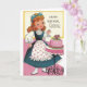 Une image vintage de carte d'anniversaire pour une soeur montre une jeune femme joyeusement surprise par un gâteau d'anniversaire joliment décoré sur un stand rose qui a été cuit juste pour elle. Le recto de la carte dit, "Joyeux anniversaire, Soeur" et le message à l'intérieur de la carte est : "Espère que ton anniversaire n'est que le début d'une année remplie de bonheur."
