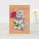 Une image vintage de carte de voeux présente un chaton gris et blanc mignon portant un ruban de lavande attaché dans un arc. Elle s'assied sur ses hanches et tient une seule rose rouge à tige comme si elle vous l'offrait. L'avant de la carte dit, "Bonjour ! Pense à toi." Le message à l'intérieur de la carte est : "J'espère que tout va bien dans votre petit coin du monde."