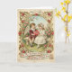This greeting card shows a vintage-style garden scene where two cherub-like children sit close together on a stone bench, their faces turned toward each other with a shy, affectionate focus 🥰. The boy wears small white wings and a deep maroon suit, and he leans forward to offer a red heart-shaped gift box that becomes the main point of attention ❤️. The girl, dressed in a white ruffled dress and bonnet, holds her hands near the box as if accepting it carefully, her posture soft and attentive. Around them, an oval gold frame wraps the picture, filled with clusters of pink and crimson roses and leafy green accents that feel like a blooming border. Above the pair, two white doves glide through the air, adding a gentle sense of closeness and calm to the scene. The background has an aged paper look in warm cream tones, giving the whole design an old postcard feel. Beneath the illustration, a ribbon banner carries the message “To My Dearest Love, A Gift From A True Heart” in dark lettering that stands out against the pale banner. The roses are arranged thickest along the sides of the oval, with smaller blooms tucked near the bottom curve of the frame.