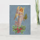 Cette carte de Noël a l'air de cartes vintages. C'est une très belle carte avec un ange tenant un sapin de Noël avec des feuilles saints et un arc rouge à ses pieds. L'arrière - plan a un look glacé et une douce neige tombe autour d'elle.