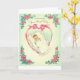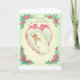 Une illustration vintage de carte de voeux présente un nouveau bébé entouré d'un ruban rose attaché en forme de coeur. Les quatre coins de la carte sont ornés de guirlandes de fleurs roses et de feuilles verts. Le recto de la carte indique, "Pour accueillir votre premier bébé" et le message à l'intérieur de la carte est : "Pour serrer dans ses bras et tenir à partir de ce jour en avant. Félicitations pour la naissance de votre nouveau bébé !"