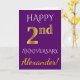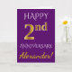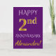 Ce design simple et personnalisé de carte de vœux d'anniversaire de mariage comporte le message "Joyeux 2e ANNIVERSAIRE", avec le "2e" ayant une apparence dorée fausse. Le devant comporte également un nom personnalisé et un fond de couleur violette. L'intérieur comporte un message de vœux d'anniversaire de mariage personnalisé. Cela pourrait être offert à un mari ou une femme pour célébrer le deuxième anniversaire de mariage du couple. [~Z0000089]