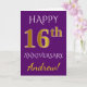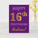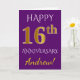 Cette carte de voeux simple et personnalisée pour anniversaire de mariage comporte le message "Joyeux 16e ANNIVERSAIRE DE MARIAGE", avec le "16e" ayant une apparence similaire à de l'or imitation. La couverture comporte également un nom personnalisé et un fond de couleur violette. L'intérieur comporte un message de voeux personnalisé pour l'anniversaire de mariage. Cela pourrait être offert à un mari ou une femme pour célébrer le seizième anniversaire de mariage du couple. [~Z0000089]